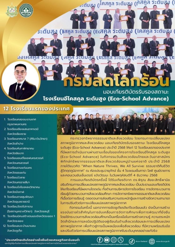 กรมลดโลกร้อน มอบเกียรติบัตรรับรองสถานะโรงเรียนอีโคสคูล ระดับสูง (Eco-School Advance) 12 โรงเรียนแรกของประเทศ
