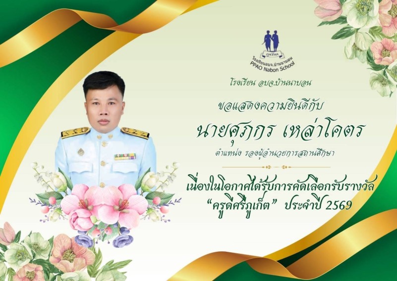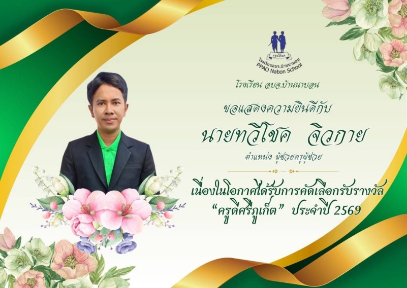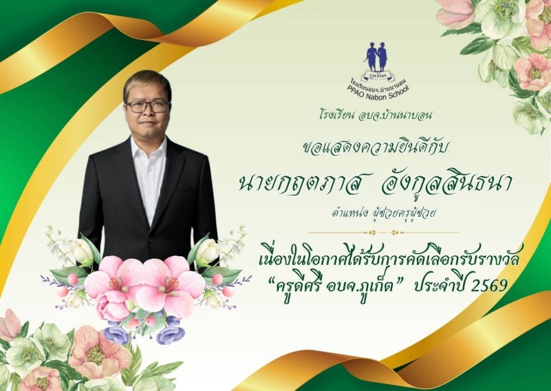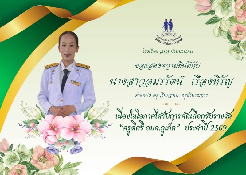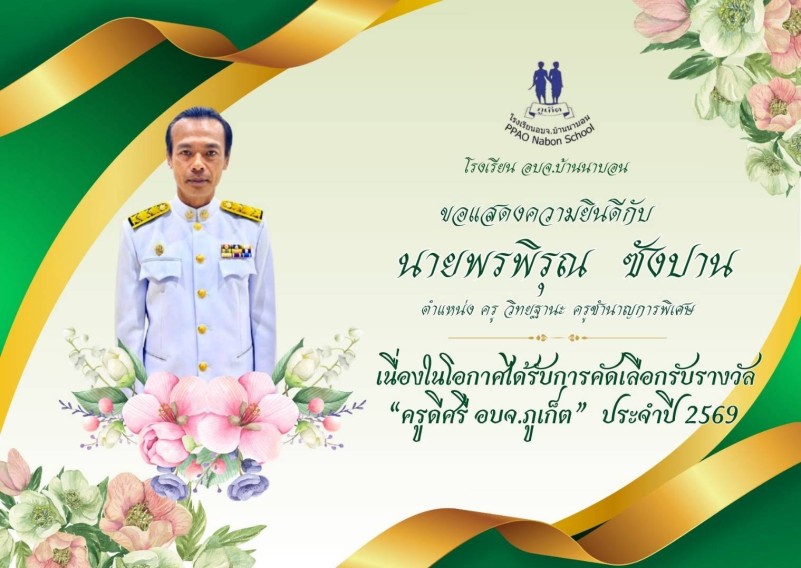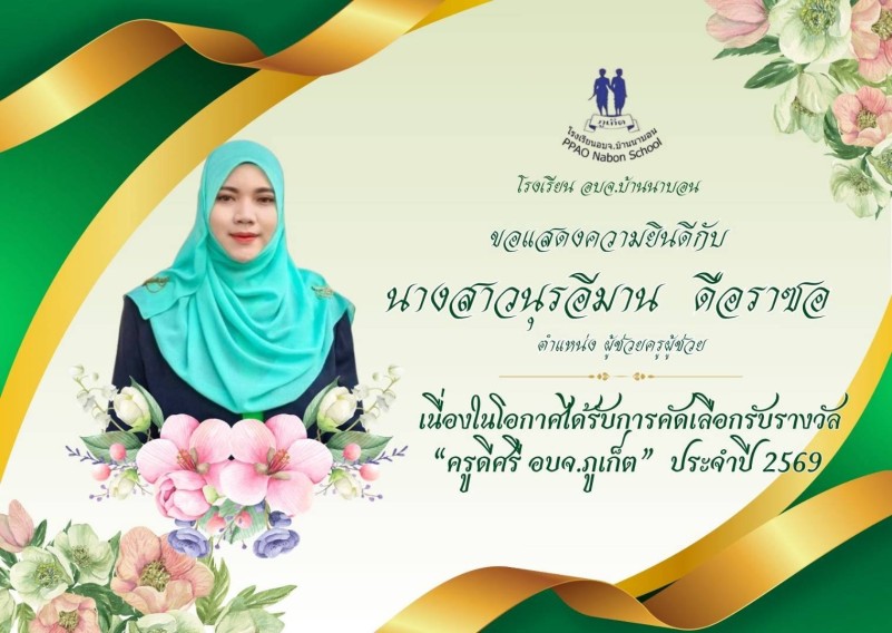 โรงเรียน อบจ.บ้านนาบอน ขอแสดงความยินดีกับ ผู้บริหาร และคุณครูทุกท่าน ที่ได้รับรางวัล “ครูดีศรี ภูเก็ต” และ “ครูดีศรี อบจ. ภูเก็ต” เนื่องในวันครูแห่งชาติ ประจำปี ๒๕๖๙