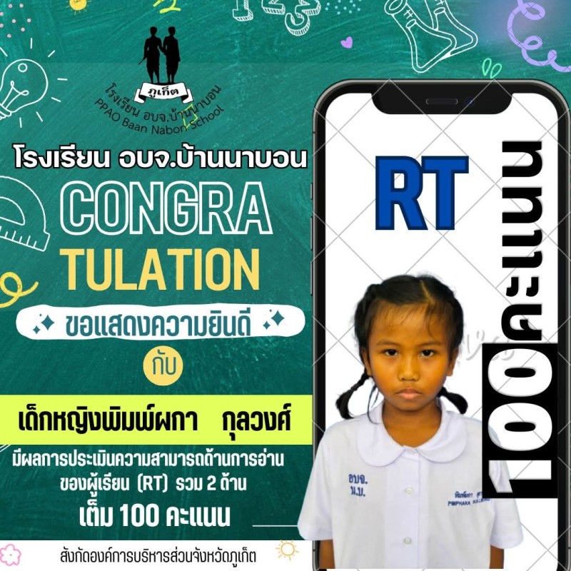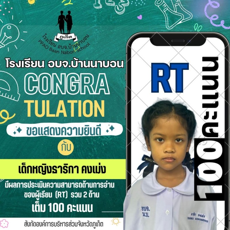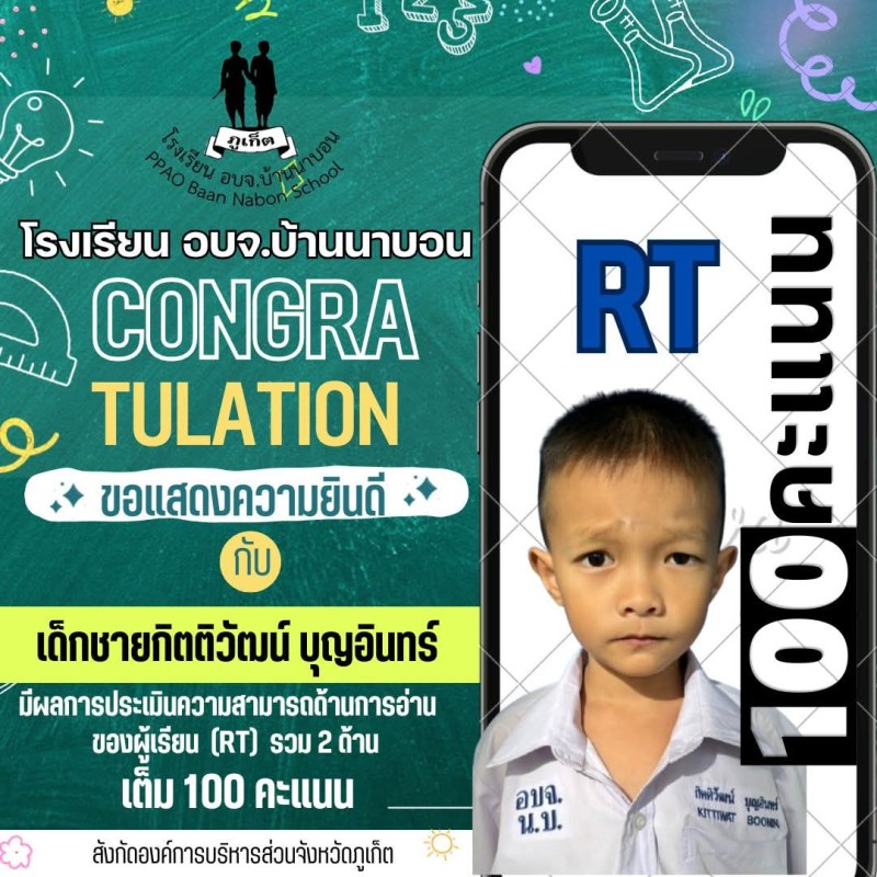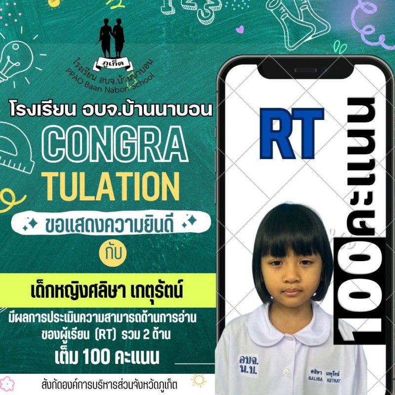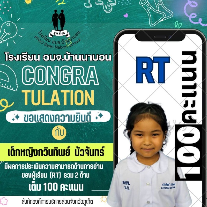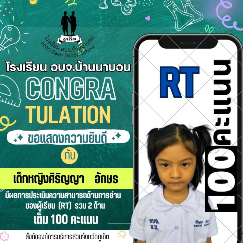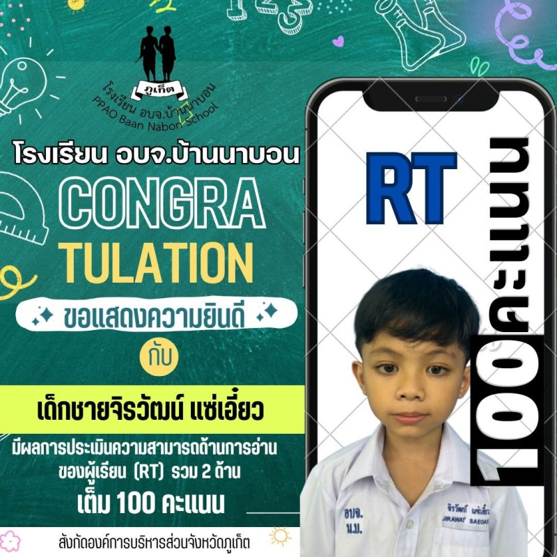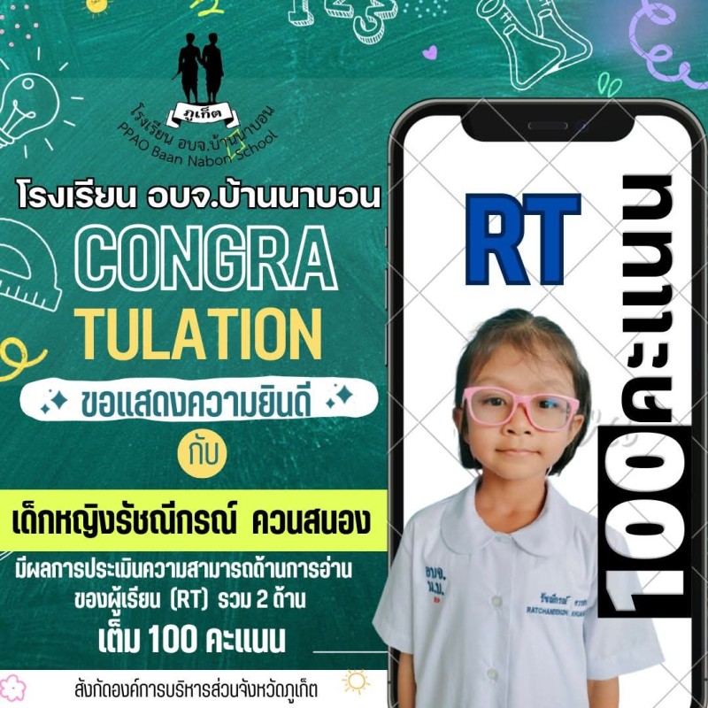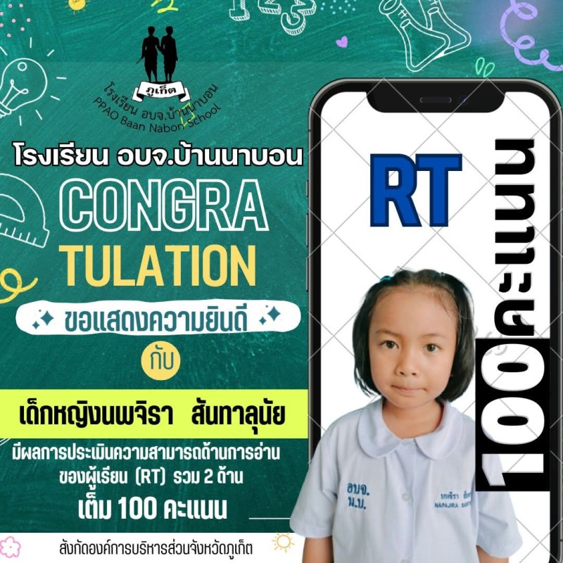 โรงเรียน อบจ.บ้านนาบอน ขอแสดงความยินดีกับนักเรียนที่ได้คะแนนเต็ม 100 คะแนน การประเมินความสามารถด้านการอ่านของผู้เรียน (RT) ชั้นประถมศึกษาปีที่ 1 ปีการศึกษา 2568