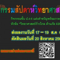 - ระดับชั้น ป.4-6 แต่งคำขวัญพร้อมวาดภาพประกอบหัวข้อ "วิทยาศาสตร์ก้าวไกล ต้านภัย COVID-19 ส่งแนบไฟล์ตามลิ้งที่กำหนด